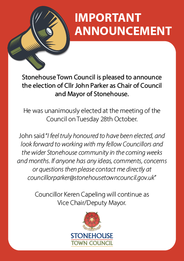 Stonehouse Town Council is pleased to announce the election of Cllr John Parker as Chair of Council and Mayor of Stonehouse. He was unanimously elected at the meeting of the Council on Tuesday 28th October. John said “I feel truly honoured to have been elected, and...